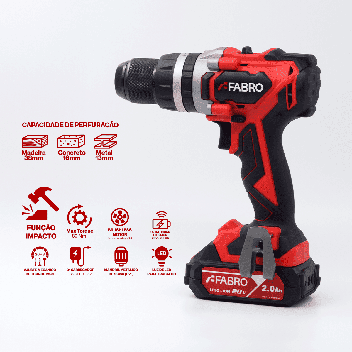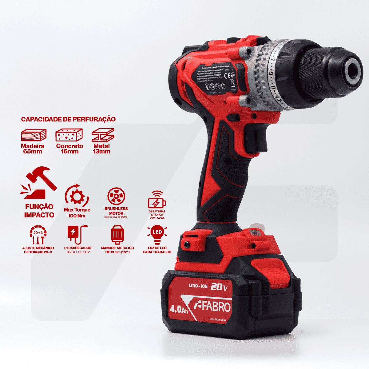 A Furadeira de Impacto / Parafusadeira Ref. Fabro / SKU – FF.SD.12.01 de 100Nm oferece a combinação perfeita de potência, mobilidade e praticidade em uma única ferramenta.