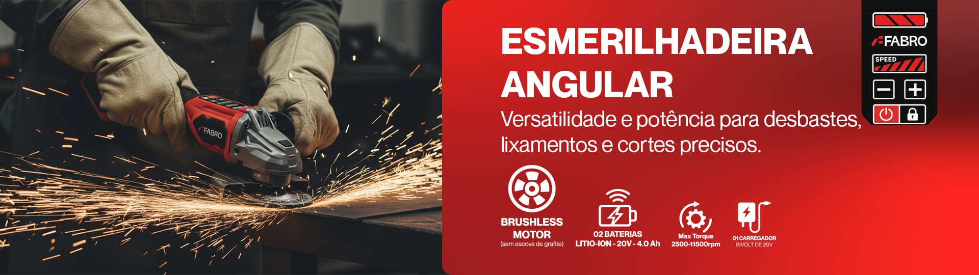 A Esmerilhadeira Angular Fabro FF.AG.07.01 reúne potência, mobilidade e praticidade em uma única ferramenta. Com motor Brushless (sem escova de grafite) e velocidade de até 11.500 rpm, é ideal para cortes precisos e desbastes eficientes em metais, concreto, mármore e outros materiais, utilizando o disco adequado.